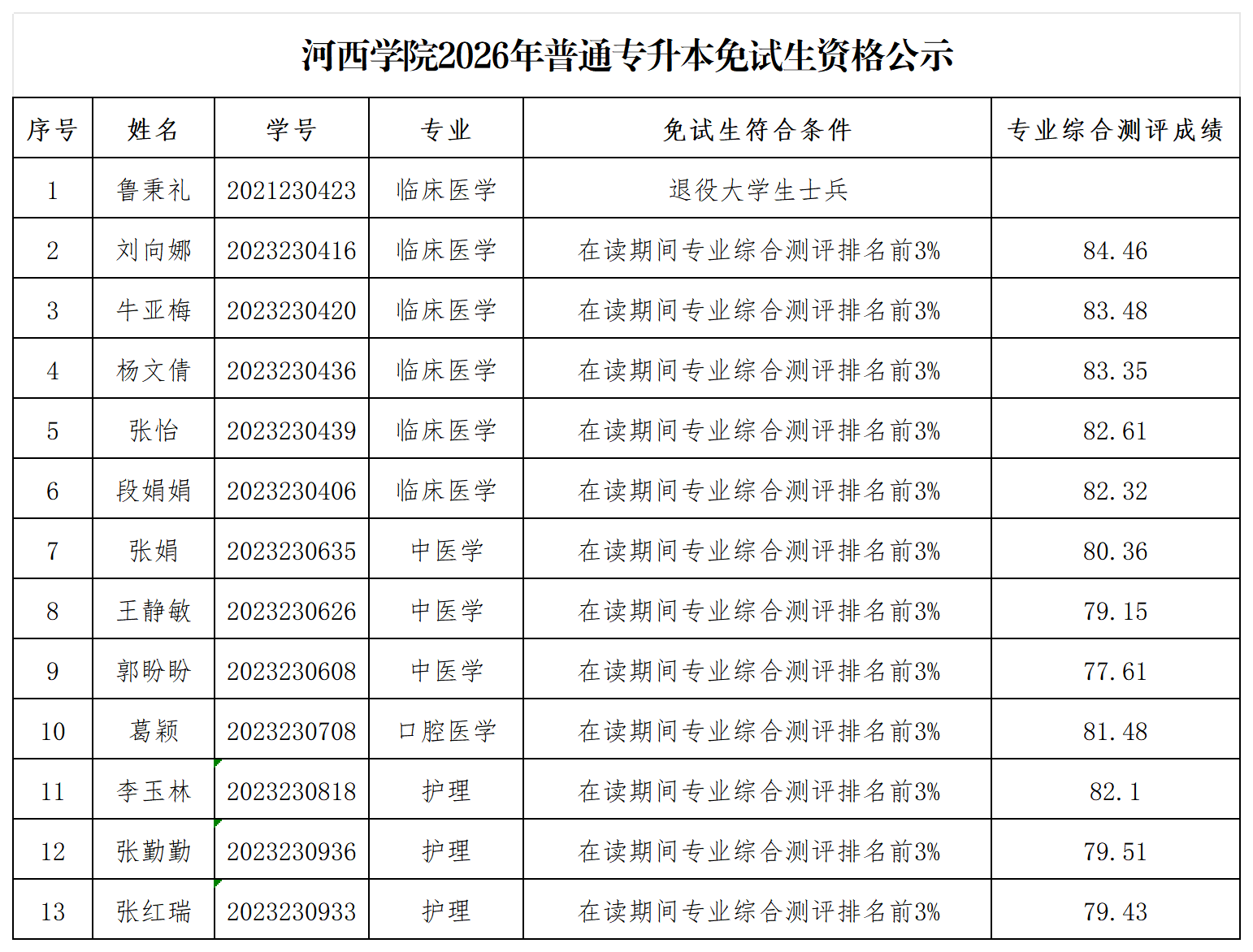 根据《关于印发2026年甘肃省普通专升本免试招生工作实施方案的通知》要求,现对我校符合2026年甘肃省普通专升本免试招生免试生资格的毕业生名单予以公示,公示期为2026年1月22日-1月26日。公示期内,如对免试资格有异议,请联系河西学院招生就业处,联系电话0936-8283598。公示期结束后,不再受理相关异议,公示毕业生将获得2026年甘肃省普通专升本免试招生免试资格。